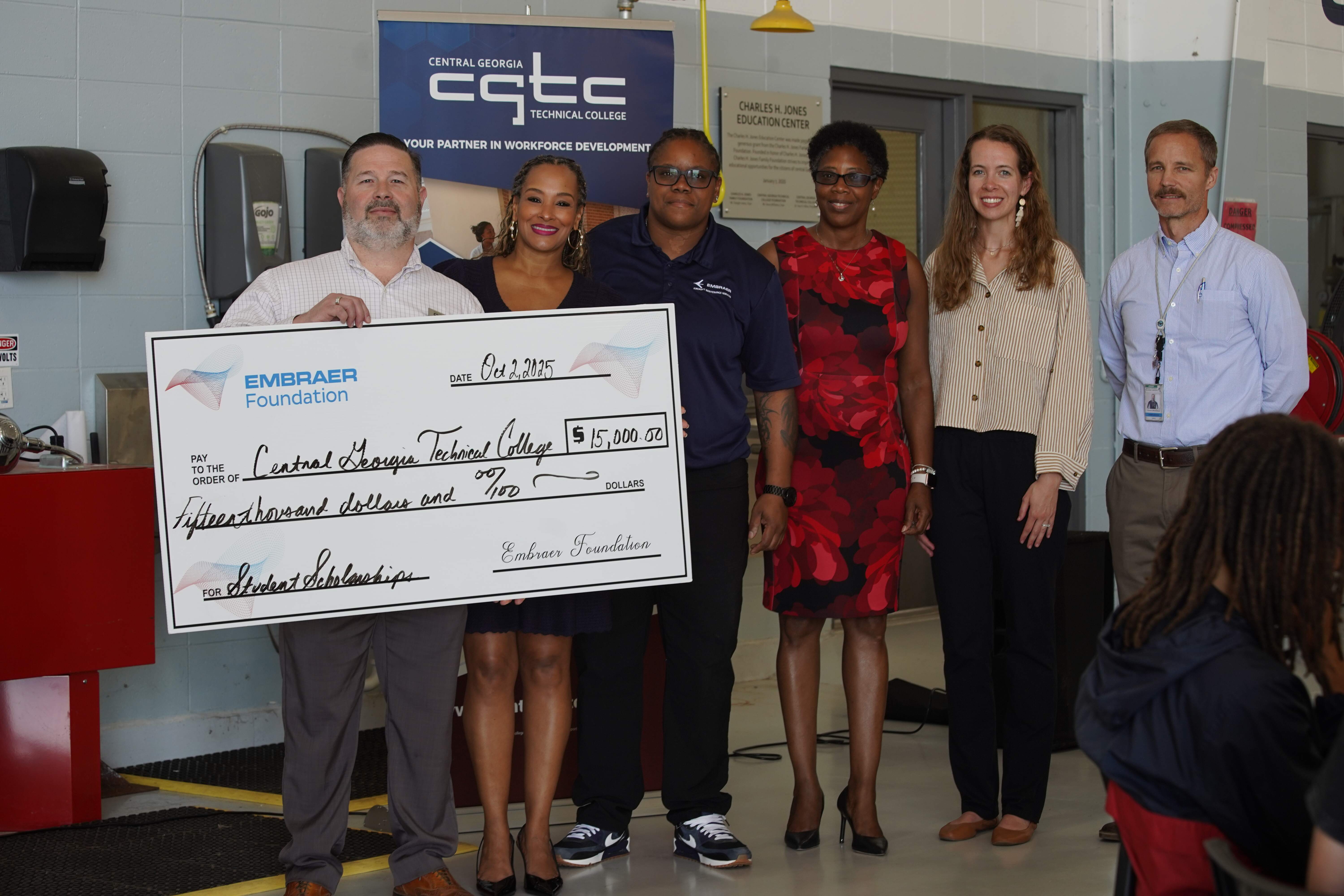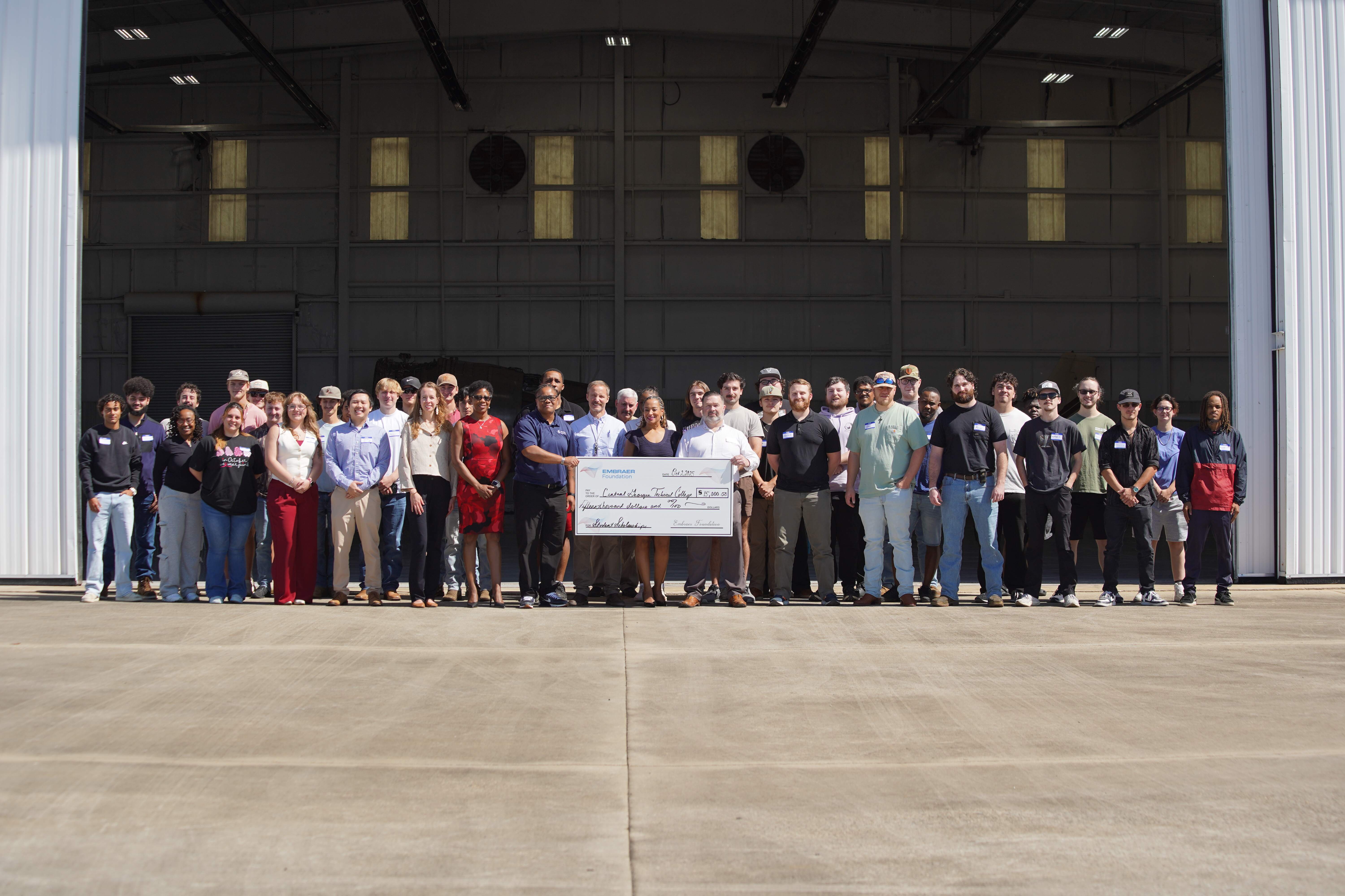 Macon, Ga. – The Embraer Foundation highlighted Central Georgia Technical College (CGTC) aviation students at a special event at the Peyton Anderson Aviation Lab, part of the Central Georgia Aerospace Training and Sustainment Center at the Middle Georgia Regional Airport. The showcase included a check presentation for $15,000 to the CGTC Foundation for student scholarships.